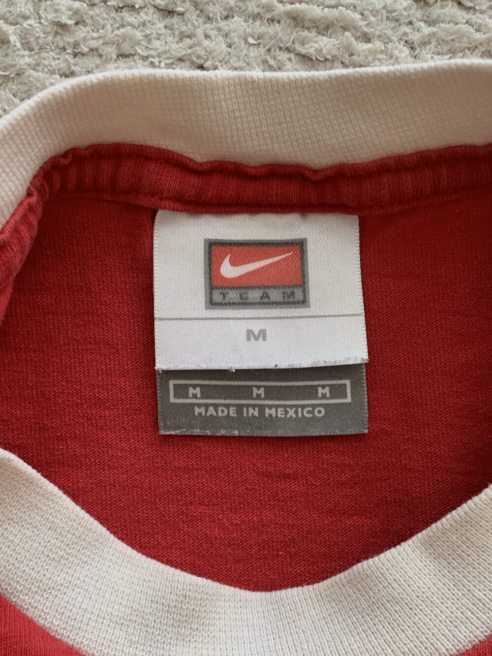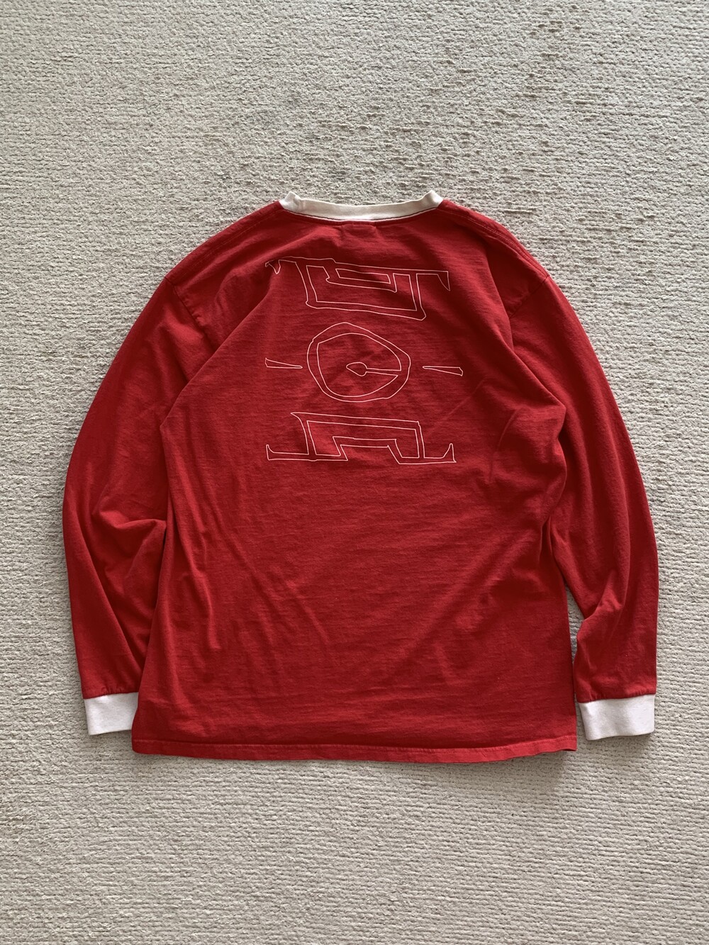 전면에는 손으로 직접 쓴 듯한 울퉁불퉁하고 러프한 폰트, 후면에는 작전판을 연상케하는 그림이 돋보이는 2000년대 초중반에 발매된 나이키의 팀웨어 중 하나인 코튼 소재 롱슬리브 티셔츠. 트레블웨어 혹은 서포터즈를 위한 팀웨어로 소매 부분만 배색이 다른 투톤 사양이 돋보이는 제품입니다.