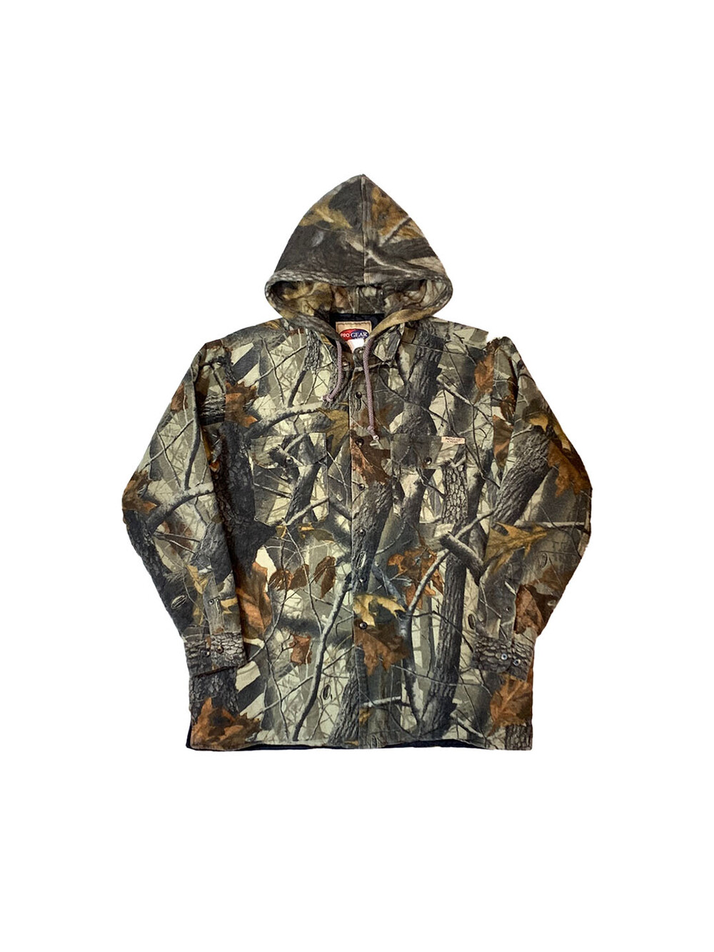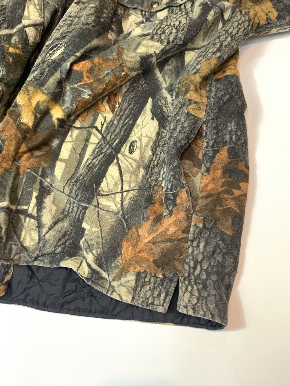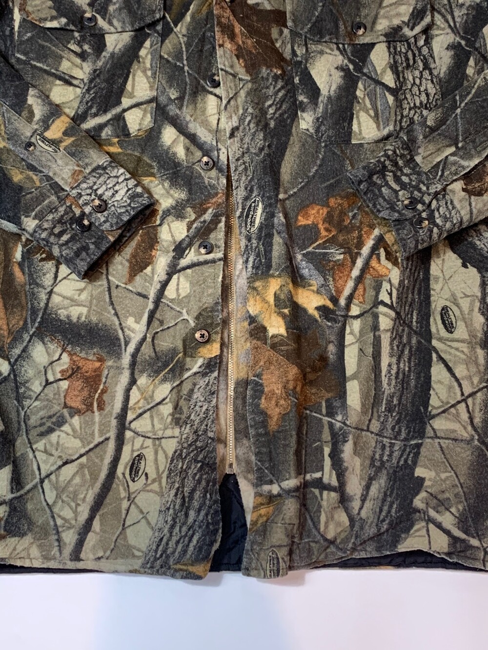 브러시드 코튼 겉감의 리얼트리 프린티드 셔츠입니다. 후드와 지퍼 클로징 부분은 플리스 소재로, 몸판과 소매 안쪽은 퀼티드 라이닝이 붙어 간절기에 가벼운 아우터 혹은 동계 이너로 활용하기 좋을만한 제품입니다.