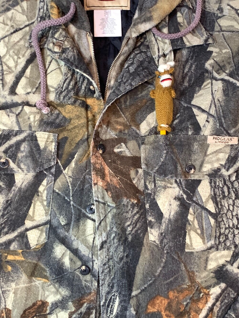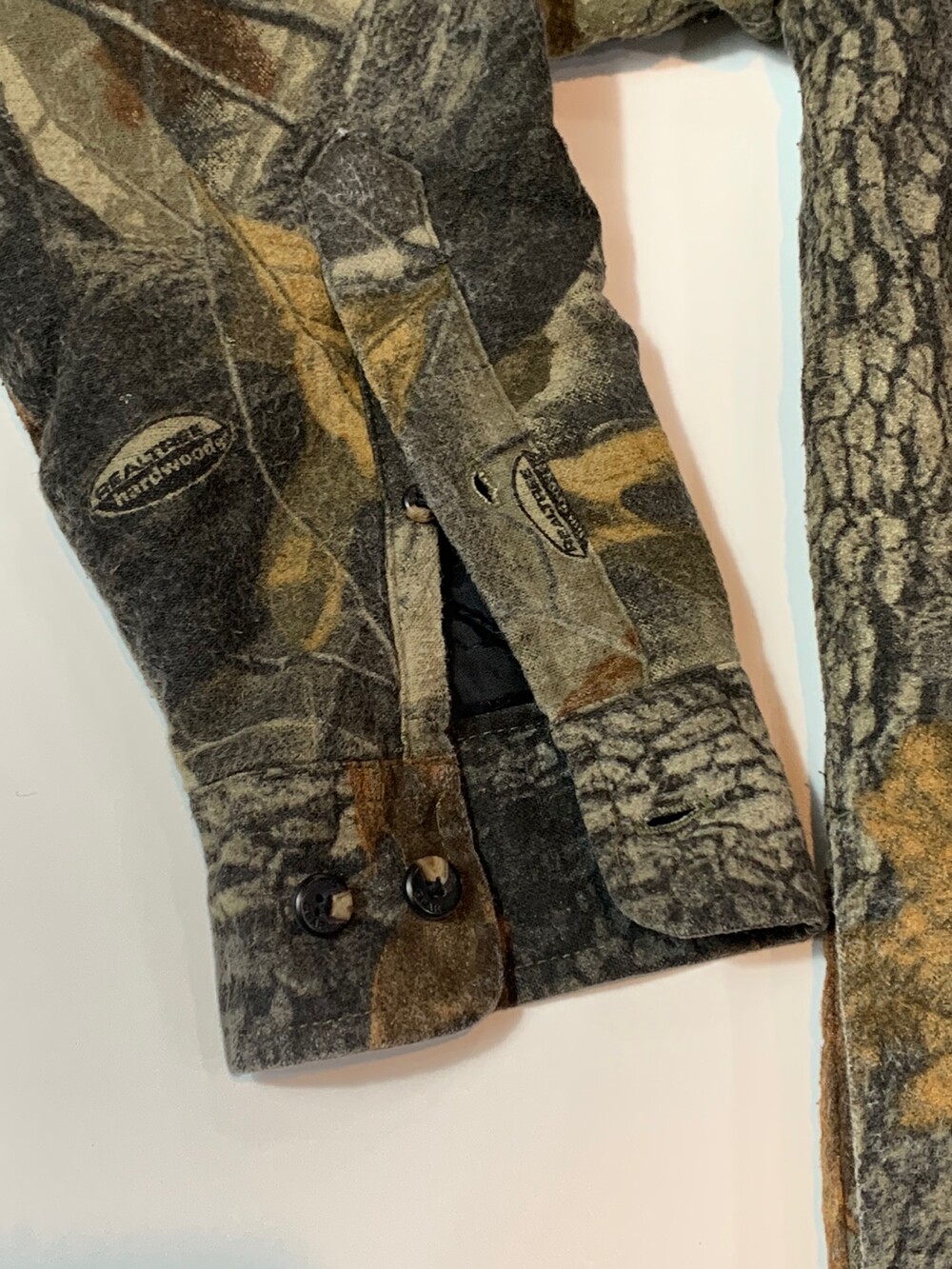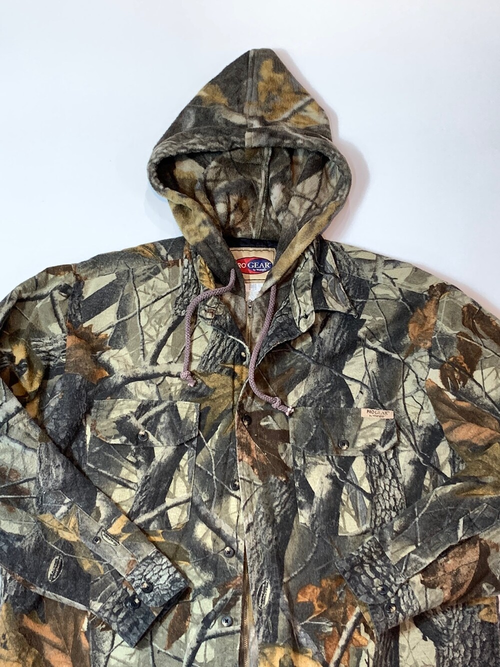 브러시드 코튼 겉감의 리얼트리 프린티드 셔츠입니다. 후드와 지퍼 클로징 부분은 플리스 소재로, 몸판과 소매 안쪽은 퀼티드 라이닝이 붙어 간절기에 가벼운 아우터 혹은 동계 이너로 활용하기 좋을만한 제품입니다.