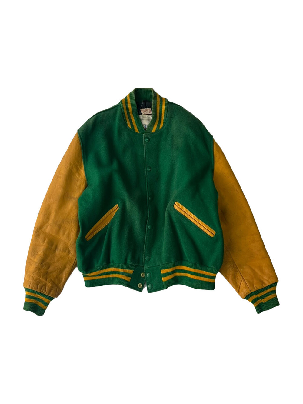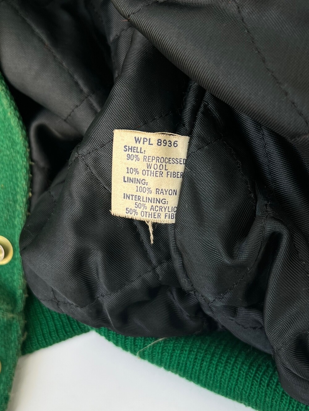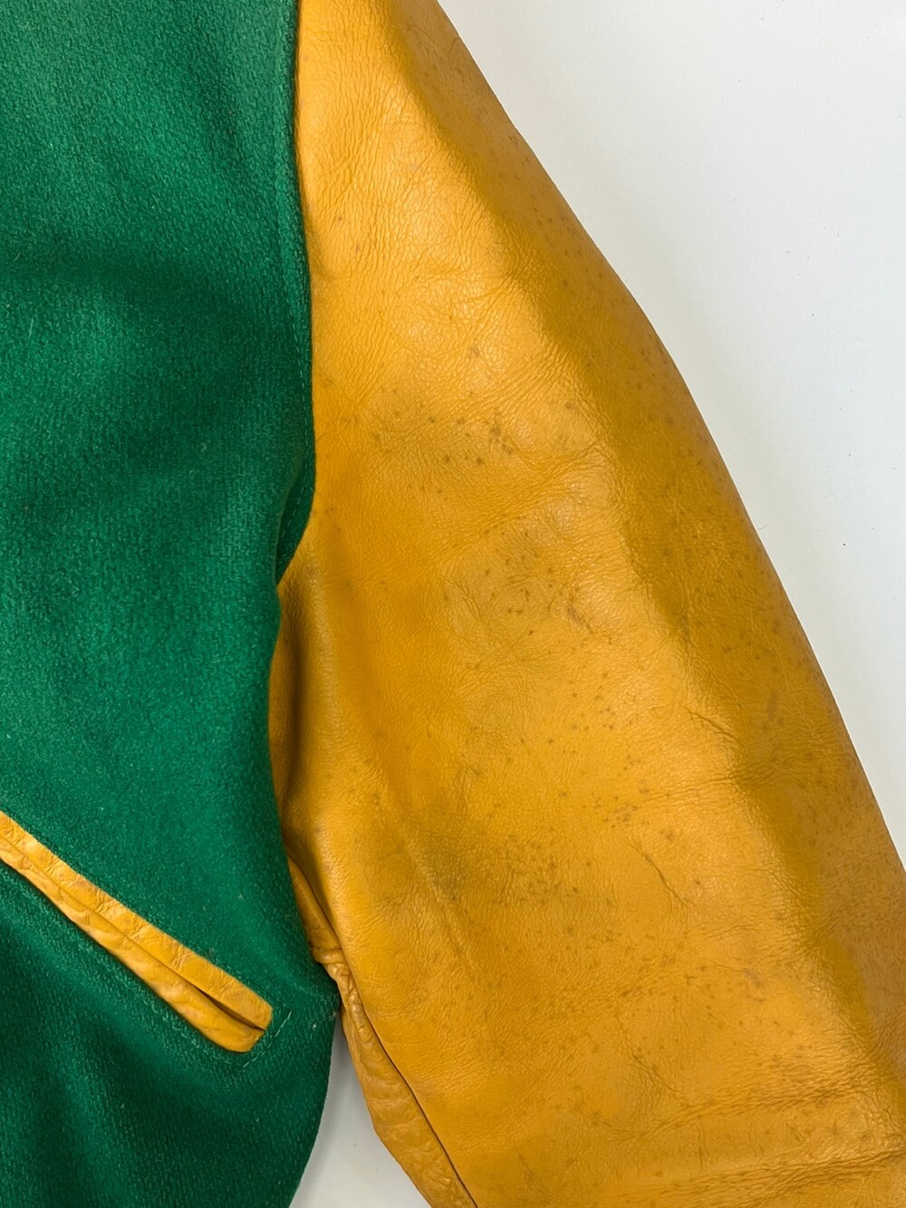 🚩Detail 몸판 및 소매 퀼티드 라이닝이 붙는, 추정컨대 어워드자켓 메이커인 DeLong에 생산을 맡기고 그 위에 Eby’s Sporting Goods의 직조 택을 단 듯한 플레인 울/레더 자켓입니다. 늘 그렇듯이 소속에 대한 정보가 따로 없어 바시티 혹은 어워드라는 수식어는 붙이지 않습니다. 연식에 따른 가죽 부분 곰팡이나 약간의 울 겉감이 닳은듯한 흔적은 있지만, 전반적으로 낡아서 바랜듯한 느낌으로 연출하기에는 더할 나위 없습니다. 실측상으로는 제법 클 듯하지만 넓은 가슴단면에 비해 어깨 너비가 좁고 소매 너비가 그다지 여유롭지는 않습니다. 100-102호 사이로 입는 분께 권장드립니다.