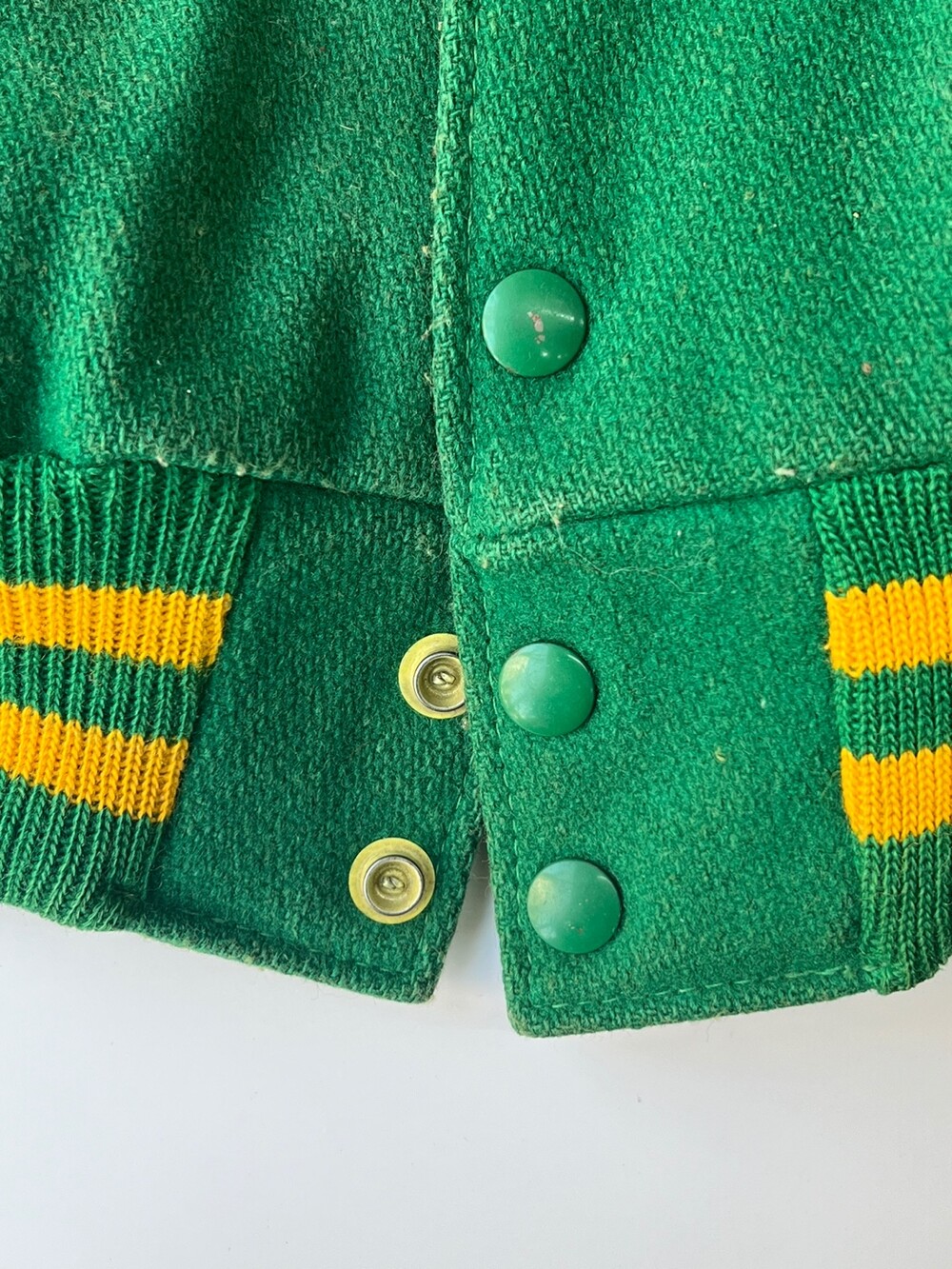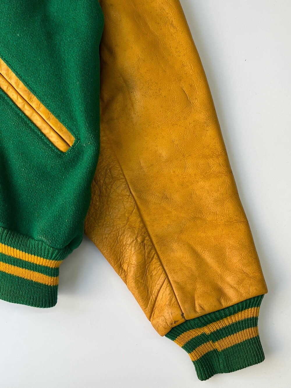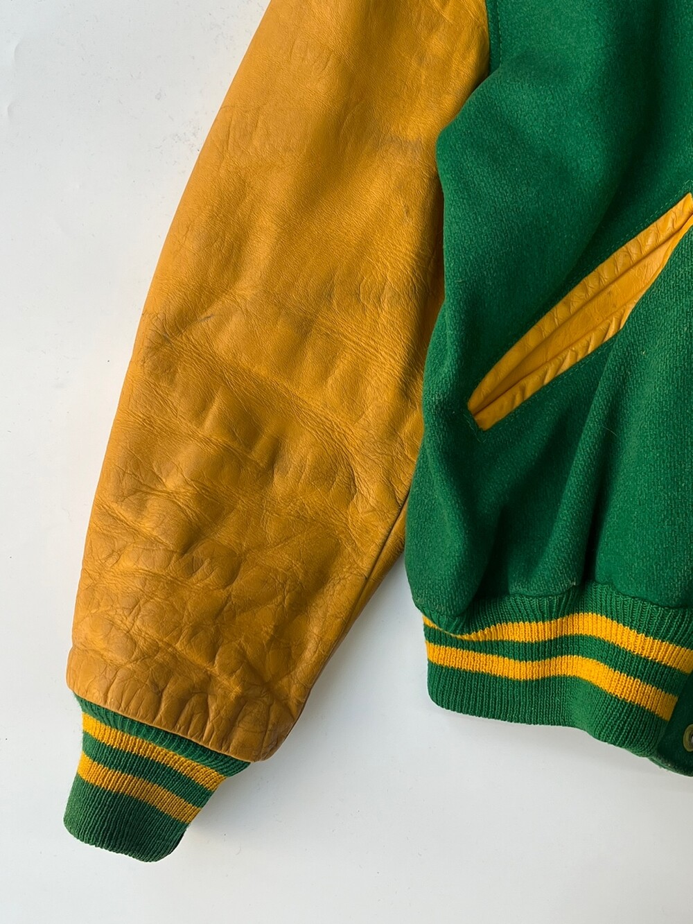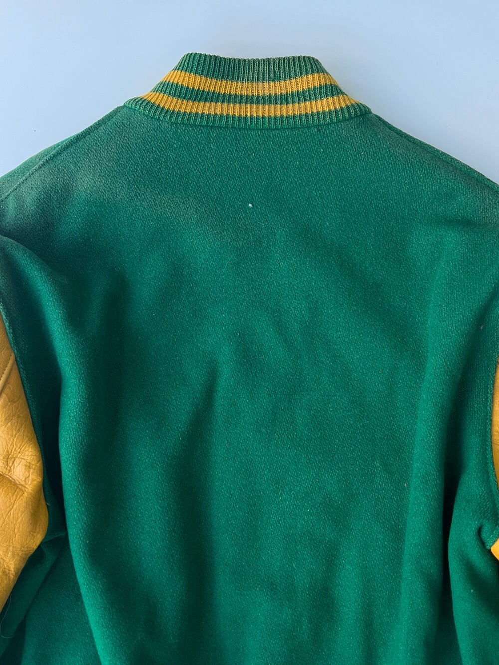 🚩Detail 몸판 및 소매 퀼티드 라이닝이 붙는, 추정컨대 어워드자켓 메이커인 DeLong에 생산을 맡기고 그 위에 Eby’s Sporting Goods의 직조 택을 단 듯한 플레인 울/레더 자켓입니다. 늘 그렇듯이 소속에 대한 정보가 따로 없어 바시티 혹은 어워드라는 수식어는 붙이지 않습니다. 연식에 따른 가죽 부분 곰팡이나 약간의 울 겉감이 닳은듯한 흔적은 있지만, 전반적으로 낡아서 바랜듯한 느낌으로 연출하기에는 더할 나위 없습니다. 실측상으로는 제법 클 듯하지만 넓은 가슴단면에 비해 어깨 너비가 좁고 소매 너비가 그다지 여유롭지는 않습니다. 100-102호 사이로 입는 분께 권장드립니다.