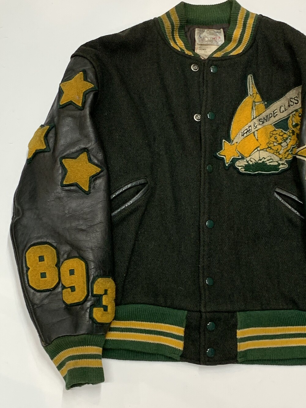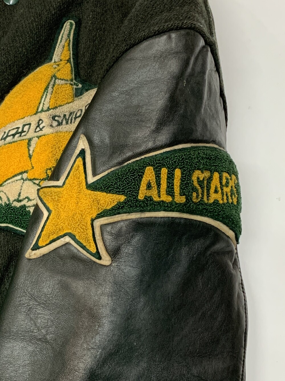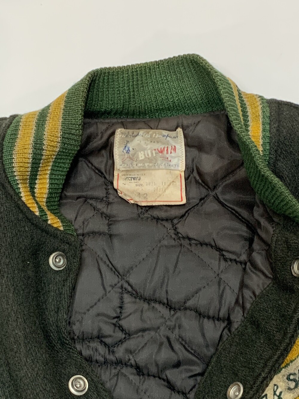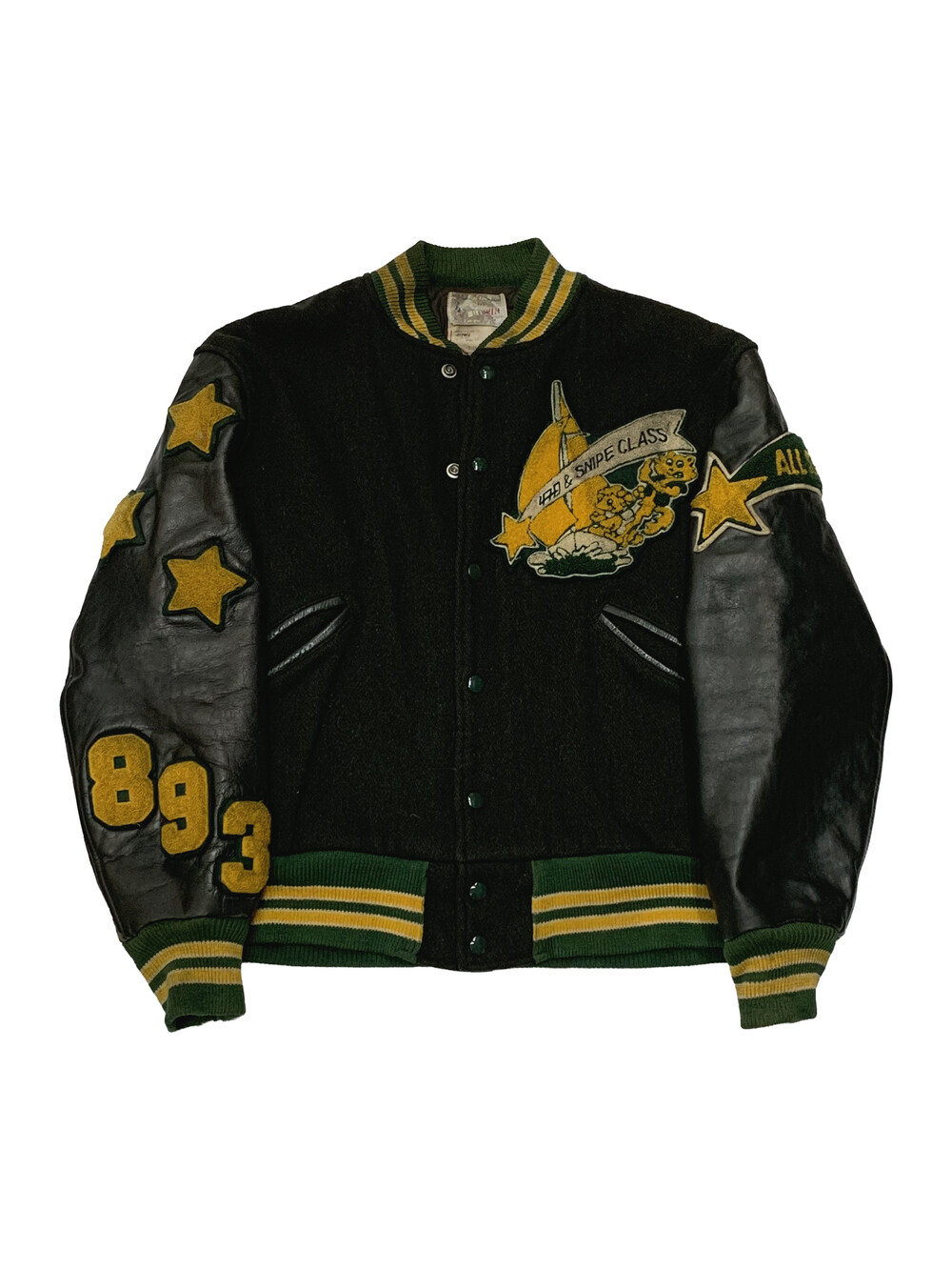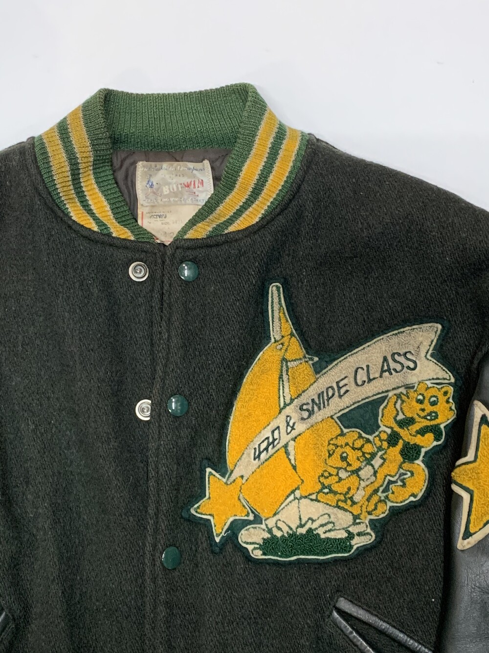 울 몸판과 레더 슬리브 조합 바디 위에 소속이나 우승횟수 등이 기록된 두께감있는 셔닐패치가 올려진, 요트 레이싱 팀에게 지급되었던 바시티 자켓입니다. 안쪽 퀼트 라이닝이나 전반적인 소재감으로 미루어 1980년대에서 90년대 사이에 생산된 것으로 추정됩니다. 클래식한 그린&옐로우 배색으로 치노팬츠나 데님팬츠 등 아메리칸 캐주얼 장르의 하의에 어울릴만한 제품입니다.