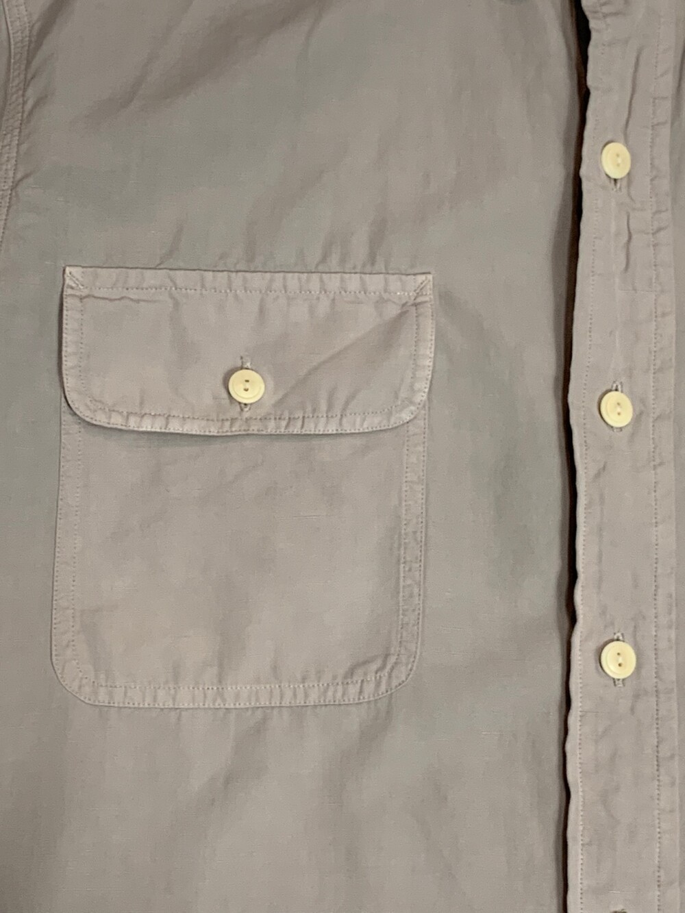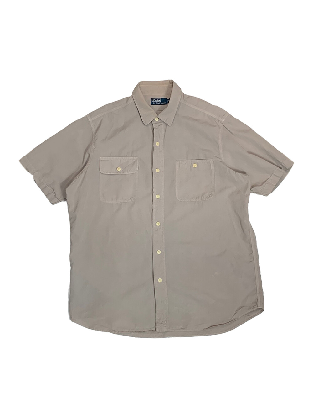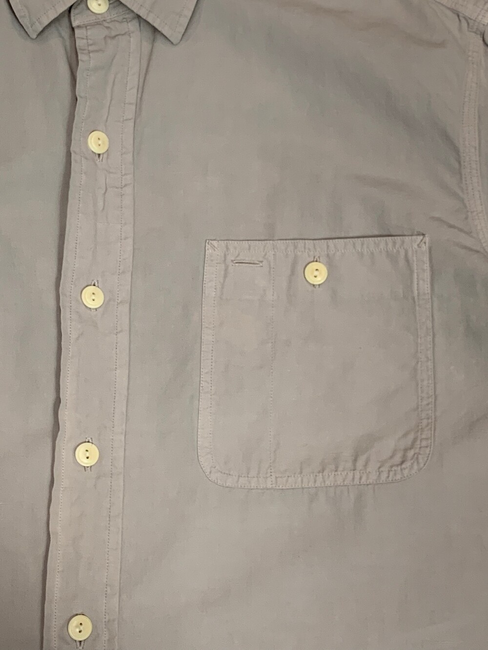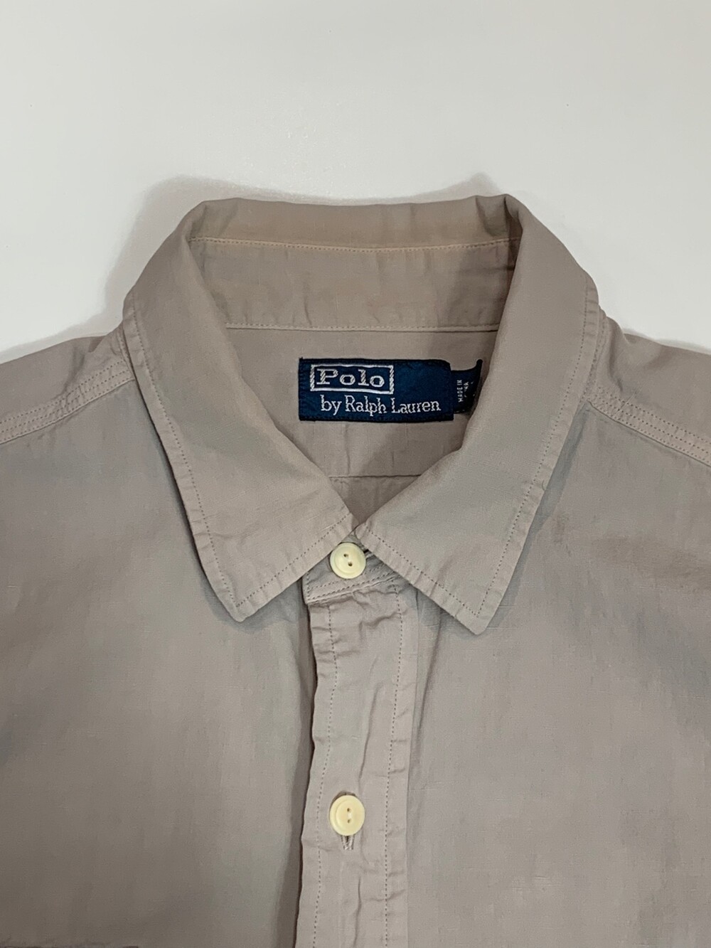 얇고 가벼운 평직 원단, 어깨와 암홀과 몸판 등 주요 봉제선을 잇는 트리플 스티치, 전면 비대칭형 포켓 등의 디테일이 덩가리 워크셔츠(DUNGAREE WORKSHIRT)를 떠올리게 하는 폴로 랄프로렌의 반팔 셔츠. 카키 컬러가 섞은 옅은 그레이 컬러로 색상 조합에 구애받지 않고 착용하기 좋을만한 제품입니다.