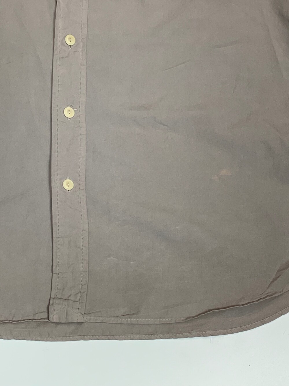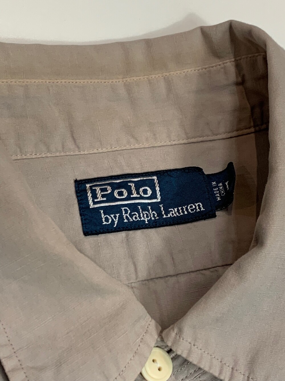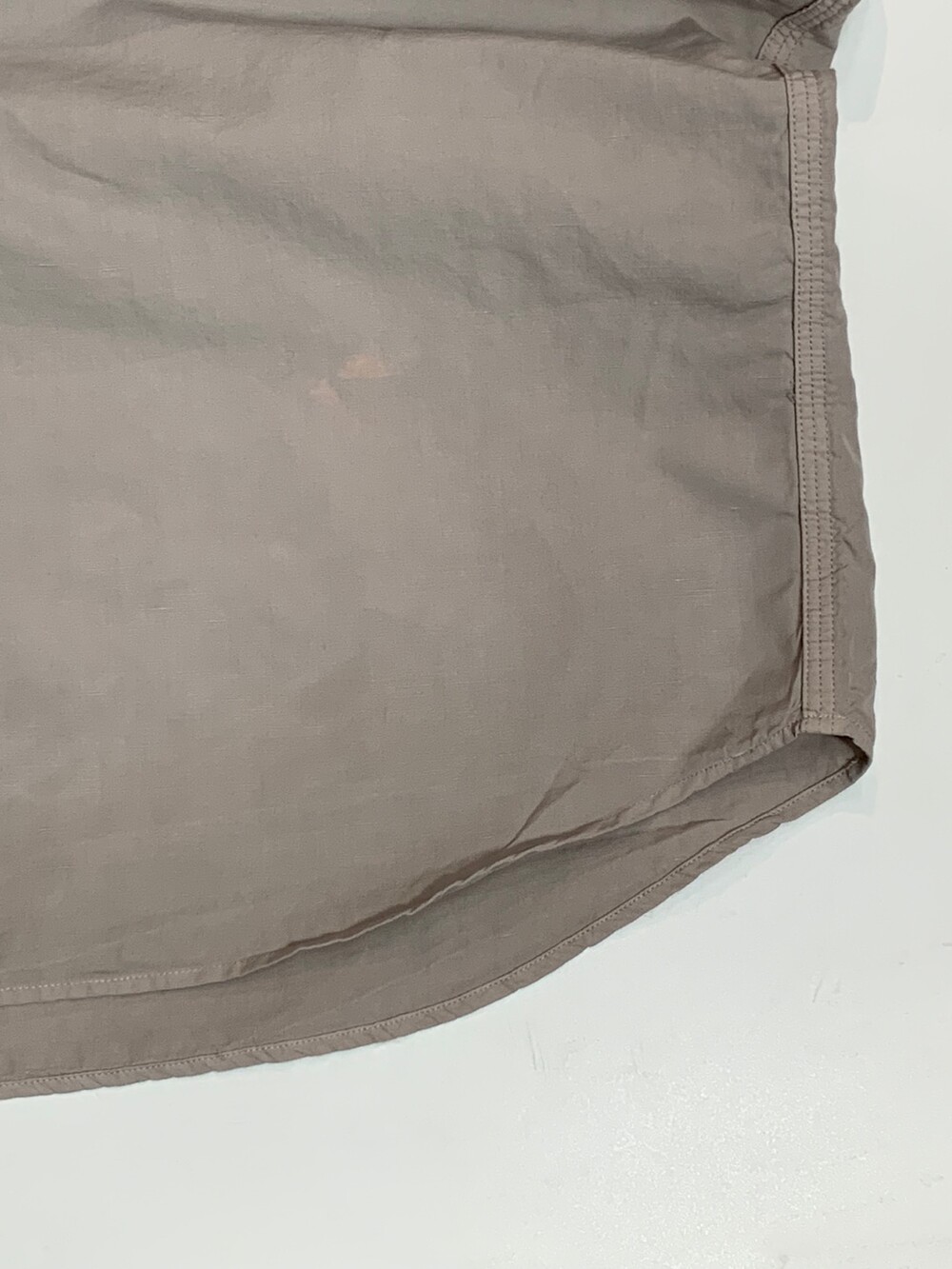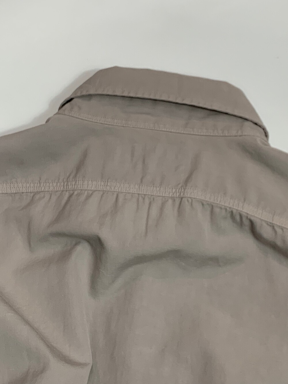 얇고 가벼운 평직 원단, 어깨와 암홀과 몸판 등 주요 봉제선을 잇는 트리플 스티치, 전면 비대칭형 포켓 등의 디테일이 덩가리 워크셔츠(DUNGAREE WORKSHIRT)를 떠올리게 하는 폴로 랄프로렌의 반팔 셔츠. 카키 컬러가 섞은 옅은 그레이 컬러로 색상 조합에 구애받지 않고 착용하기 좋을만한 제품입니다.