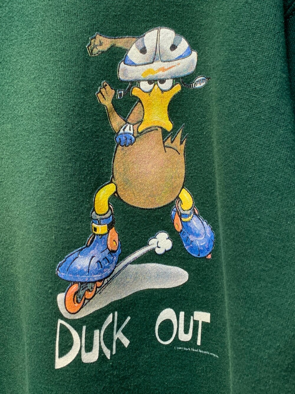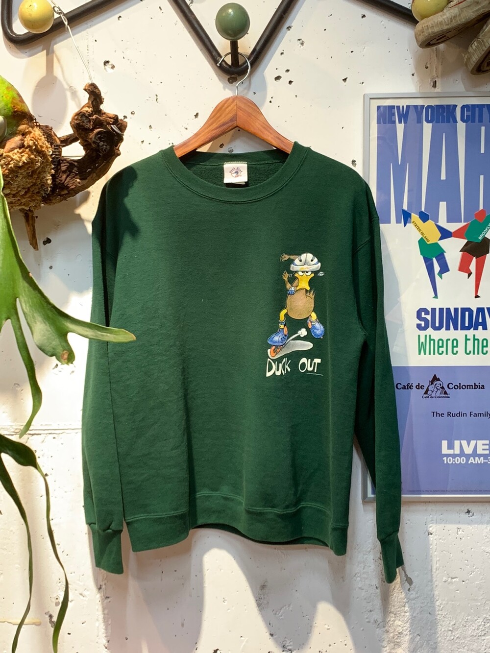 19세부터 군용 텐트 원단으로 작업용 바지를 만들어 판매하던 아웃도어 브랜드 덕헤드. 그들이 주로 사용하던 덕캔버스 원단에서 착안하여 브랜드 이름을 붙였다고 합니다. 몸판 옆 부분에 봉제선이 없는 튜블러 타입의 스웻셔츠 바디 위에 DUCK OUT 오리 캐릭터 프린팅이 붙은 캐주얼한 분위기의 제품입니다.