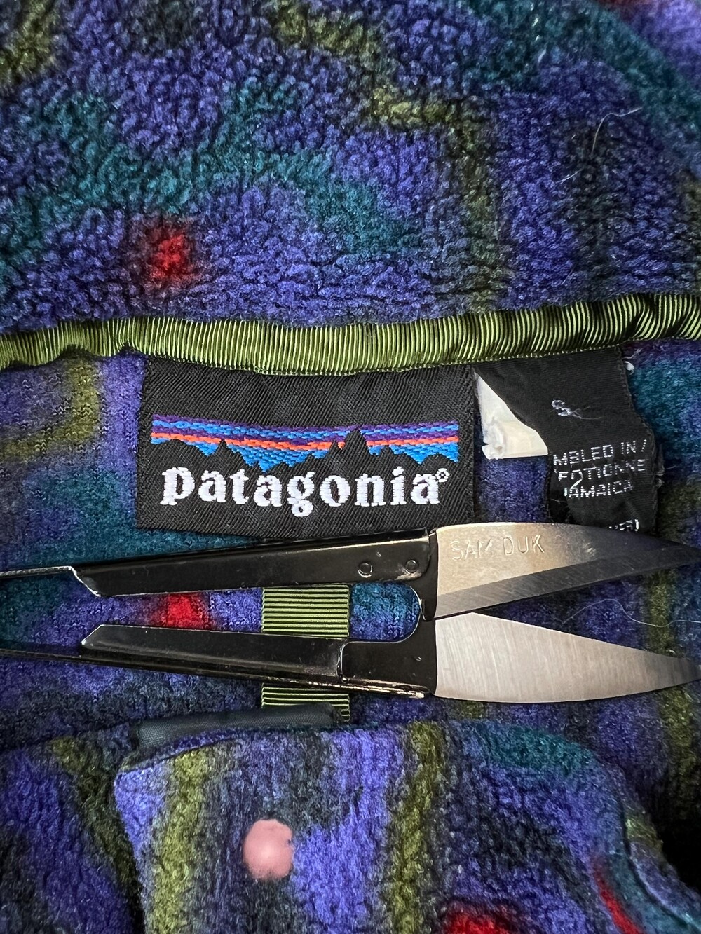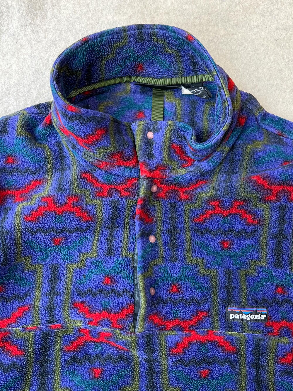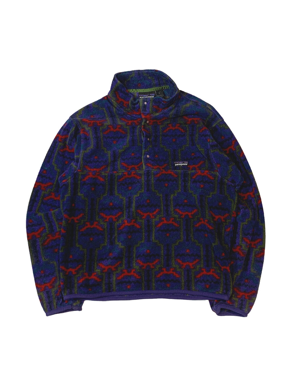 🚩Detail 세계 각지의 문화권에서 사용하던 전통 문양을 어레인지한 패턴이 적용된 프린티드 신칠라 스냅 티셔츠입니다. 칠레와 아르헨티나 남부에 위치한 파타고니아 및 팜파 지역 토착민을 지칭하는 테우엘체(Tehuelche)부족의 직물 패턴과 동일한 프린팅이 적용된 제품입니다. 그 중에서도 파타고니아 라벨에 흰 외곽선이 없는, 이른바 '눈 없는 산'으로 불리는 라벨이 적용된 보기드문 개체입니다.